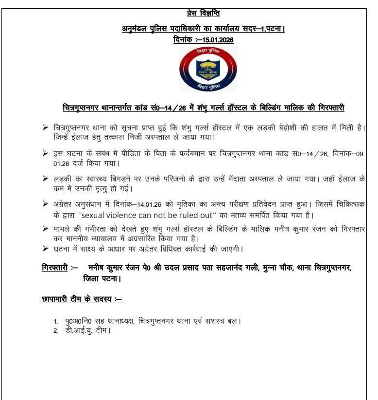 "рдкрдЯрдирд╛ рд╣реЙрд╕реНрдЯрд▓ рдЯреНрд░реЗрдЬреЗрдбреА: рдЫрд╛рддреНрд░ рдХреА рдореМрдд рдХреЗ рдмрд╛рдж рдмрд┐рд▓реНрдбрд┐рдВрдЧ рдорд╛рд▓рд┐рдХ рдЧрд┐рд░рдлреНрддрд╛рд░, рдпреМрди рд╣рд┐рдВрд╕рд╛ рдХрд╛ рд╢рдХ"