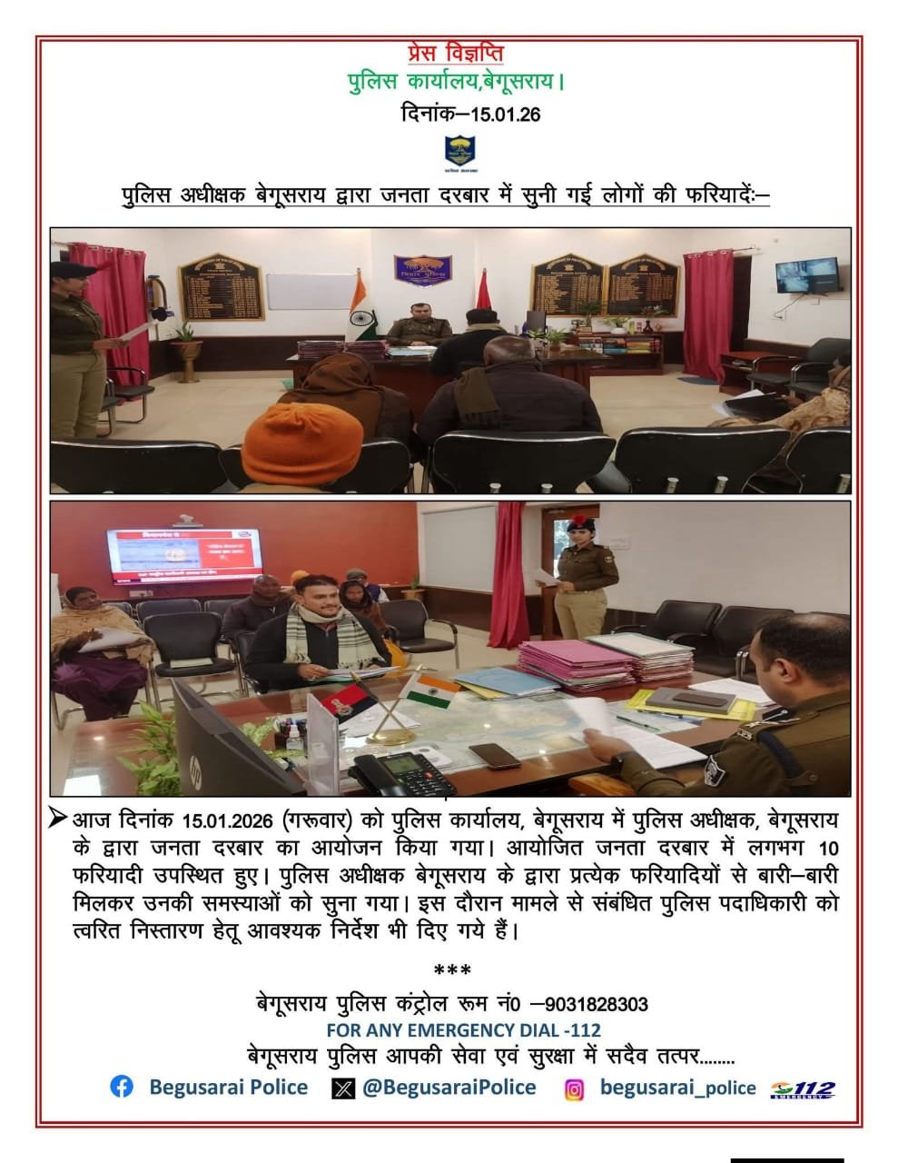 "рдмреЗрдЧреВрд╕рд░рд╛рдп рдореЗрдВ рдкреБрд▓рд┐рд╕ рдЕрдзреАрдХреНрд╖рдХ рдХреЗ рдЬрди рд╕реБрдирд╡рд╛рдИ рджрд░рдмрд╛рд░ рдореЗрдВ рднреАрдбрд╝ рдЬрдорд╛ рд╣реБрдИ, 10 рд╢рд┐рдХрд╛рдпрддрдХрд░реНрддрд╛рдУрдВ рдХреА рд╕рдорд╕реНрдпрд╛рдПрдВ рдореМрдХреЗ рдкрд░ рд╣реА рд╕реБрд▓рдЭрд╛рдИ рдЧрдИрдВред"